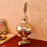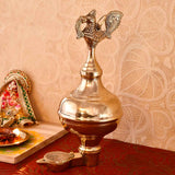 | This Akhand brass deep designed with mayur . Deep has a stylishly made storage for oil/ghee. A beautifully engraved deep at the bottom of the storage is lit. The carved mayur on the top is spectacular. The deep also has a ring for hanging provision. |