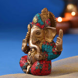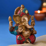 Make any occasion auspicious with this colourful brass idol of Ganesha. With a trishul on forehead and an Om on his trunk, Ganesha looks extremely divine. The glazed colourful stone chips add to the look on the brass metal. Makes an excellent gifting option