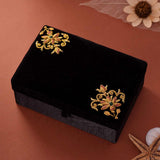 Artistically designed jewellery box, completes the wardrobe . The embroidery work done on the jewellery box gives a niche look and the black velvet bckground enhances the design more. This designer box can be used to stack your bangles or any other accessory too.