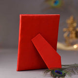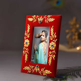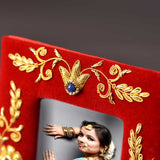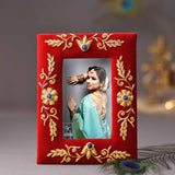 A wonderful token of love to gift to your close ones to express your affection. Zari work is done with golden thread and beads are placed in the flower to make it look more glamorous. To complement the design a perfect backdrop of red color has been wrapped on the photo frame
