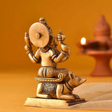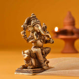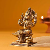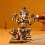 This brass idol has Ganesha seated blissfully on his favorite mouse holding up one hand to bless the universe. On the other hand is his favorite laddoo. The other two hands hold a lotus and hatchet. The intricate sculpture on his crown, trunk and mouse make the idol very auspicious.